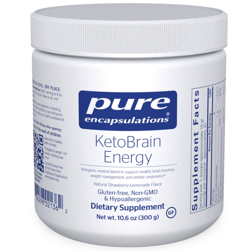 Pure Encapsulations KetoBrain Energy offers a blend of ketogenic mineral compounds to support healthy brain function, weight management, and athletic endurance.* It is designed to be used in combination with a low-carb diet and/or to support brain and muscle function.* KetoBrain Energy also contains 10 grams of beta-hydroxybutyrate per serving.